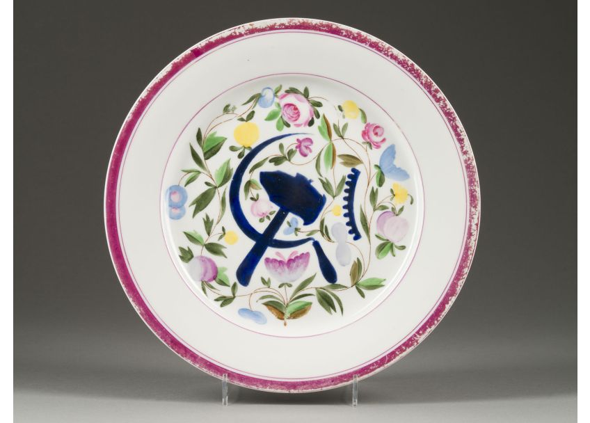 Porzellan, polychrome Aufglasurbemalung. D. 24,4 cm. Doppeladler mit grüner Farbe übermalt, aufglasurblaue Manufakturmarke mit Hammer und Sichel, datiert '1918'. Beide Marken grün durchgestrichen. Ränder part. berieben.