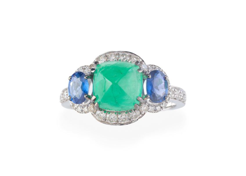 Smaragd-Cabochon-Ring, umgeben von Saphiren und Diamanten